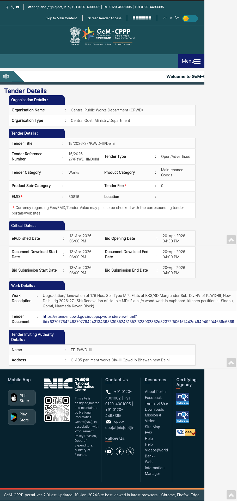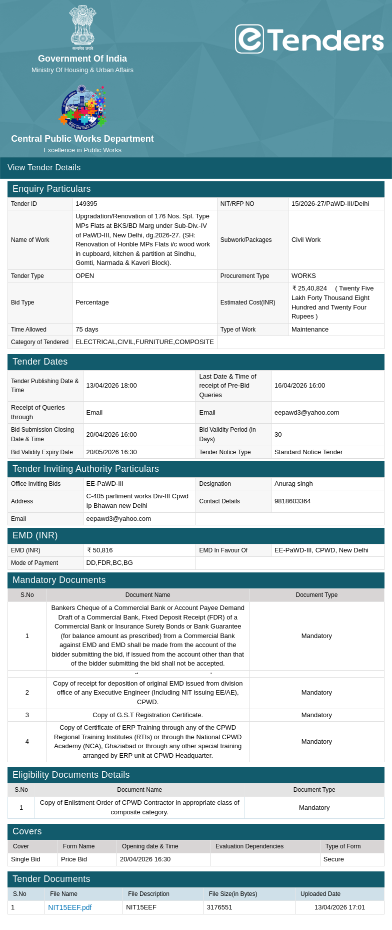 : Upgradation/Renovation Of 176 Nos. Spl. Type Mps Flats At Bks/Bd Marg Under Sub-Div.-Iv Of Pawd-Iii, New Delhi, Dg.2026-27. (Sh: Renovation Of Honble Mps Flats I/C Wood Work In Cupboard, Kitchen Partition At Sindhu, Gomti, Narmada Kaveri Block). |